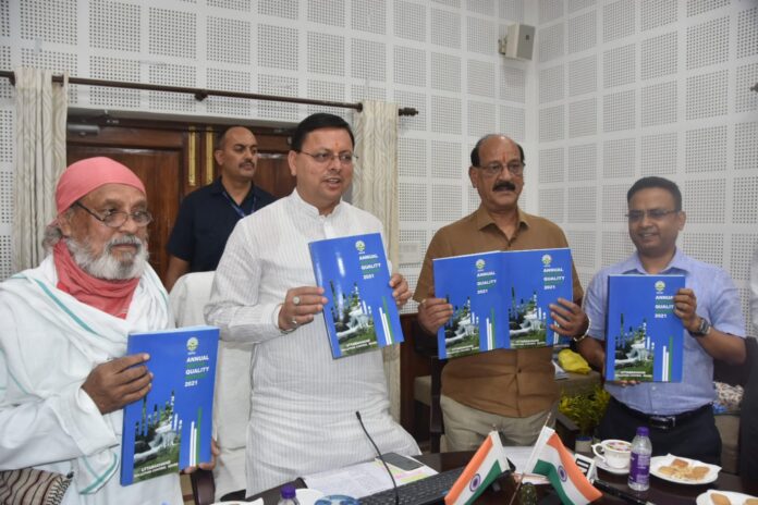 मुख्यमंत्री पुष्कर सिंह धामी ने विश्व पर्यावरण दिवस पर मुख्यमंत्री कैम्प कार्यालय में आयोजित कार्यक्रम में उत्तराखण्ड पॉल्यूशन कन्ट्रोल बोर्ड द्वारा प्रकाशित पुस्तक ‘‘एनुअल वाटर क्वालिटी रिपोर्ट 2021‘‘ का विमोचन किया। इस अवसर पर मुख्यमंत्री ने घोषणा की कि चंपावत को वोकल फॉर लोकल आधारित आर्थिकी एवं पारिस्थितिकी के रूप में खड़ा किया जायेगा, ताकि हिमालय के लिए यह एक मॉडल बन सके। उन्होने कहा कि सचिवालय एवं विधानसभा को प्लास्टिक मुक्त बनाया जायेगा। प्लास्टिक मुक्ति का अभियान निरन्तर चलाया जायेगा। मुख्यमंत्री ने कहा कि प्रदेश के सभी शहरों में स्वच्छता अभियान चलाया जाए। देहरादून से इसकी शुरुआत की जाए, उसके बाद अन्य शहरों में स्वच्छता के अभियान चलाये जाए। उन्होंने जिलाधिकारियों को निर्देश दिये कि प्रत्येक जनपद में 75 आर्द्रभूमियों की पहचान कर उनका जीर्णोद्धार करना सुनिश्चित करें। उन्होंने कहा कि वर्षा जल संचयन, सौर ऊर्जा, पर्यावरण पर्यटन की दिशा में भी विशेष ध्यान देने की जरूरत है। मुख्यमंत्री ने कहा कि सभी जिलाधिकारी एवं मुख्य विकास अधिकारी विशेष ध्यान रखें कि जनपदों के दुर्गम क्षेत्रों में मार्गों की कनेक्टिविटी अच्छी हो, कनेक्टिविटी की छोटी-छोटी योजनाओं को प्राथमिकता पर रखा जाए।