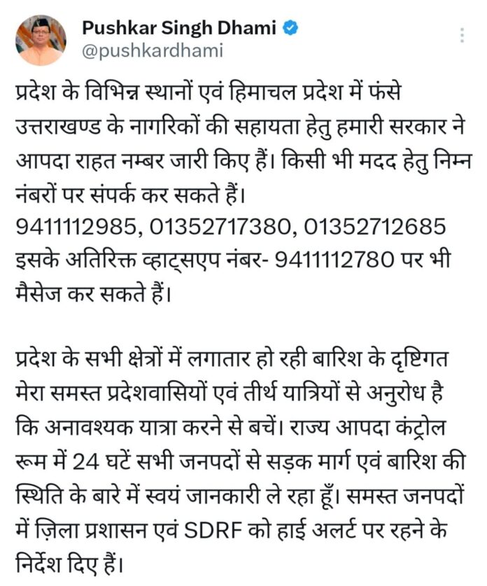 भारी बारिश के बीच धामी सरकार ने जारी किए आपदा राहत नम्बर, मुख्यमंत्री ने आमजन से अपील की है कि बारिश के दृष्टिगत समस्त प्रदेशवासी एवं तीर्थयात्री अनावश्यक यात्रा से बचें