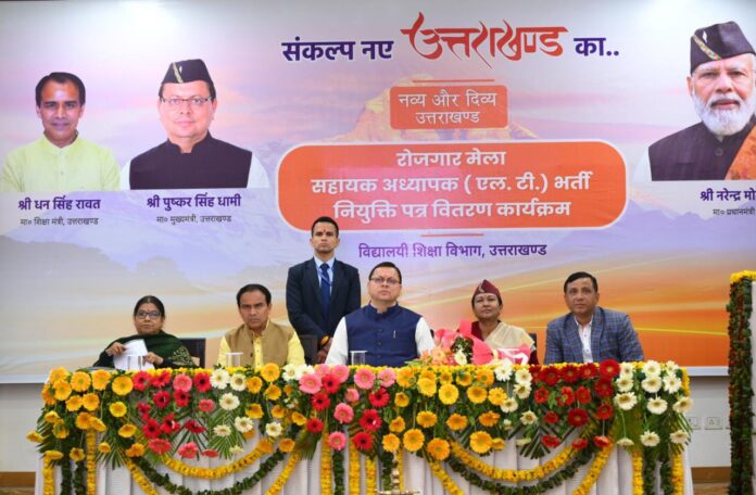 मुख्यमंत्री पुष्कर सिंह धामी एव शिक्षा मंत्री डॉ. धन सिंह रावत द्वारा मुख्यमंत्री आवास स्थित मुख्य सेवक सदन में 05 विषयों के चयनित सहायक अध्यापकों (एलटी) को नियुक्ति पत्र प्रदान किये। शिक्षा विभाग के अन्तर्गत 1431 सहायक अध्यापकों को नियुक्ति पत्र प्रदान किये जा रहे हैं। मुख्य सेवक सदन में 150 सहायक अध्यापकों को आज नियुक्ति पत्र प्रदान किये गये।