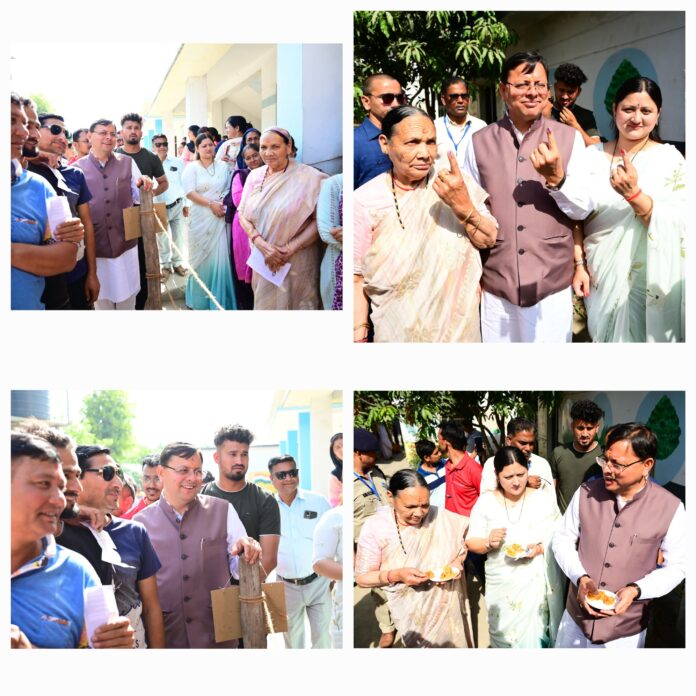 मुख्यमंत्री धामी ने परिवारजनों के साथ लाइन में लगकर आम मतदाता की भांति किया मतदान