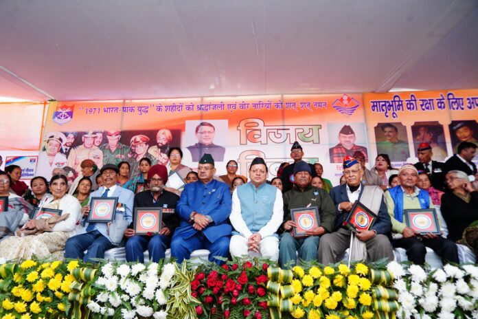 सोमवार को गांधी पार्क में आयोजित विजय दिवस समारोह में अपने संबोधन की शुरुआत मुख्यमंत्री पुष्कर सिंह धामी ने 1971 के य़ुद्ध में शहीद हुए सैनिकों को श्रद्धांजलि अर्पित करने के साथ की। इसके बाद मुख्यमंत्री पुष्कर सिंह धामी ने कहा कि भारतीय सैनिकों ने 1971 के युद्ध में न केवल राष्ट्र की अखंडता और स्वाभिमान की रक्षा की बल्कि अपने अद्वितीय रण कौशल द्वारा दुश्मन को चारों खाने चित्त भी कर दिया। मुख्यमंत्री ने कहा कि 1971 में पाकिस्तान के साथ लड़ा गया यह युद्ध स्वतंत्र भारत के इतिहास का एक ऐसा स्वर्णिम अध्याय है, जो प्रत्येक भारतीय के लिए गौरव और प्रेरणा का स्रोत है। 1971 के युद्ध में हमारी सेना ने विश्व को दिखा दिया कि भारत न केवल अपनी संप्रभुता की रक्षा करने में सक्षम है, बल्कि जरूरत पड़ने पर मानवता और न्याय की रक्षा के लिए भी खड़ा हो सकता है। इस युद्ध में हमारी तीनों सेनाओं ने मात्र 13 दिनों में पाकिस्तान को घुटने टेकने पर मजबूर कर दिया था।