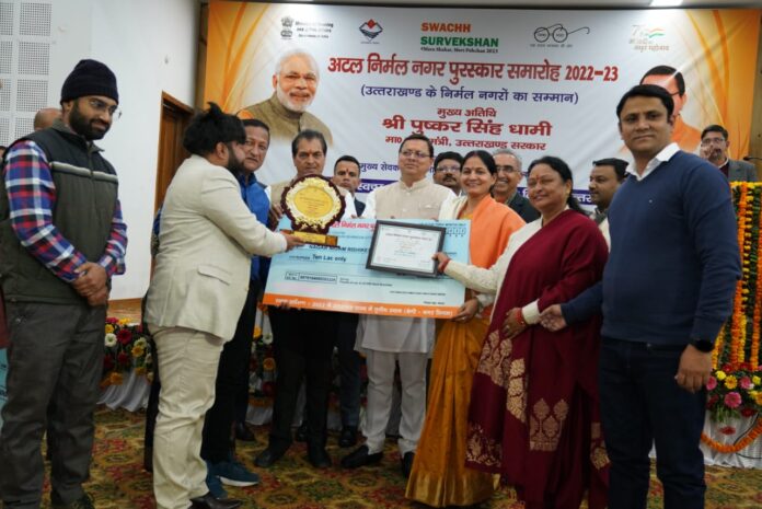 मुख्यमंत्री पुष्कर सिंह धामी ने सोमवार को मुख्यमंत्री आवास स्थित मुख्य सेवक सदन में स्वच्छ सर्वेक्षण-2022 में बेहतर प्रदर्शन करने वाले निर्मल नगरों को अटल निर्मल नगर पुरस्कार 2023 से सम्मानित किया। इस अवसर पर प्रदेश के 09 निकायों को अटल निर्मल पुरस्कार एवं राष्ट्रीय स्तर पर पुरस्कृत 05 निकायों को स्वच्छ गौरव सम्मान प्रदान किया गया।