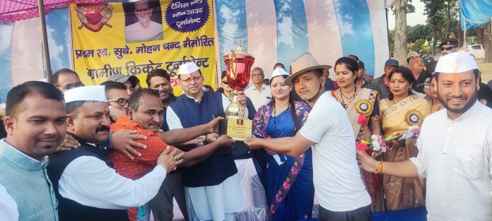 बनबसा के ग्राम भजनपुर में आयोजित प्रथम स्व.सूबेदार मोहन चंद स्मृति ग्रामीण क्रिकेट प्रतियोगिता के फाइनल मुकाबले में प्रदेश के मुख्यमंत्री पुष्कर सिंह धामी ने प्रतिभाग कर विजेता एवं उप विजेता टीमों को पुरस्कृत किया व विजेता मजगांव की टीम को 21 हजार तथा उप विजेता उचोलिगोठ की टीम को 11 हजार रुपये की धनराशि के चैक प्रदान किए। उन्होंने विजेता एवं उपविजेता टीमों को बधाई दी और उनके उज्ज्वल भविष्य की कामना की। उन्होंने कहा कि खेल का मैदान हमें अनुशासन सिखाने के साथ ही जीवन में हमें आगे बढ़ना सिखाता है।