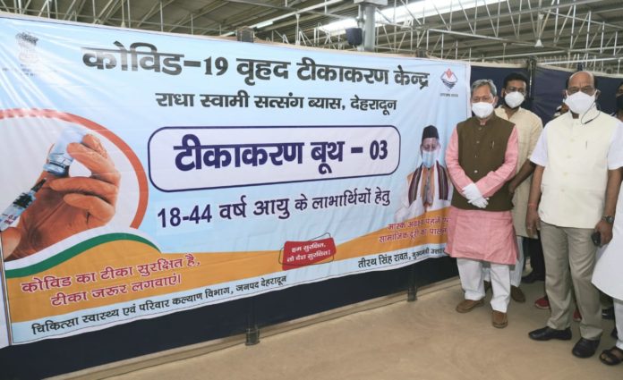 मुख्यमंत्री श्री तीरथ सिंह रावत ने राजधानी देहरादून के हरिद्वार बायपास रोड स्थित राधा स्वामी सत्संग न्यास में 18 से 44 वर्ष के लोगों के टीकाकरण अभियान का विधिवत शुभारंभ किया।