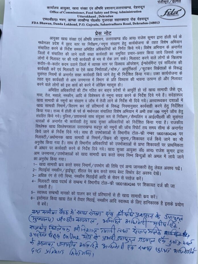 उत्तराखंड के खाद्य सुरक्षा आयुक्त डॉक्टर राजेश कुमार ने आम जनता से भी अपील की है कि