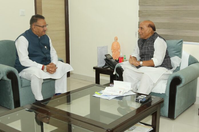 उत्तराखण्ड के सैनिक कल्याण मंत्री गणेश जोशी ने आज नई दिल्ली में देश के रक्षा मंत्री राजनाथ सिंह से शिष्टाचार भेंट की। भेंट के दौरान सैनिक कल्याण मंत्री गणेश जोशी ने उत्तराखण्ड राज्य में सैनिक कल्याण से जुड़ी विभिन्न योजनाओं और चल रहे कार्यों की जानकारी दी तथा पूर्व सैनिकों और शहीदों के परिजनों के हित में किए जा रहे प्रयासों पर चर्चा की। उन्होंने राज्य में निर्माणाधीन सैन्यधाम परियोजना की प्रगति की जानकारी भी रक्षा मंत्री को दी।