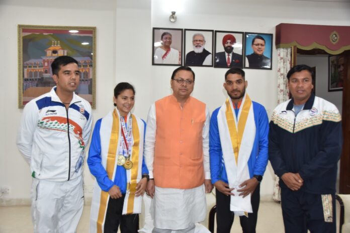 मुख्यमंत्री पुष्कर सिंह धामी से मंगलवार को मुख्यमंत्री आवास में 37वें नेशनल जूनियर एथलेटिक्स चैंपियनशिप की 10 कि.मी. रेस वाक में नेशनल रिकॉर्ड के साथ स्वर्ण पदक जीतने वाली मानसी नेगी और एथलीट सूरज पंवार ने भेंट की।