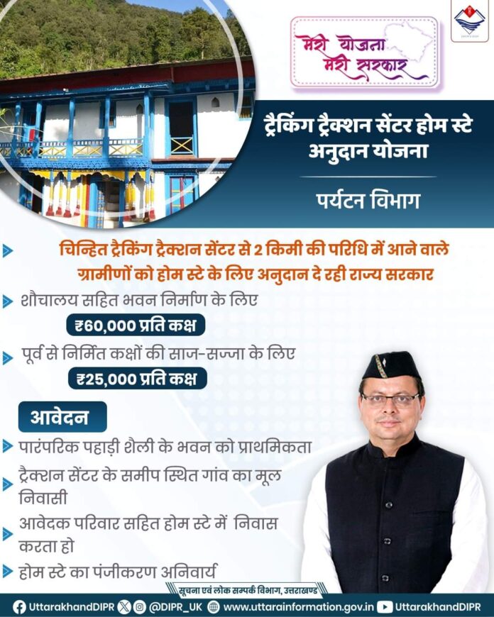 अपने लुभावने परिदृश्यों और समृद्ध सांस्कृतिक विरासत के लिए प्रसिद्ध उत्तराखंड भारत में पर्यटन के लिए एक महत्वपूर्ण गंतव्य के रूप में उभरा है। मुख्यमंत्री पुष्कर सिंह धामी के नेतृत्व में, पर्यटन के बुनियादी ढांचे को बढ़ाने और स्थानीय जुड़ाव को बढ़ावा देने के लिए विभिन्न पहलों को लागू किया गया है, जिससे क्षेत्र में सतत विकास सुनिश्चित हो सके। ऐसी ही एक पहल है “ट्रैकिंग ट्रैक्शन सेंटर होम स्टे अनुदान योजना”, पर्यटन में सामुदायिक भागीदारी को बढ़ावा देने के उद्देश्य से महत्वपूर्ण योजना है।