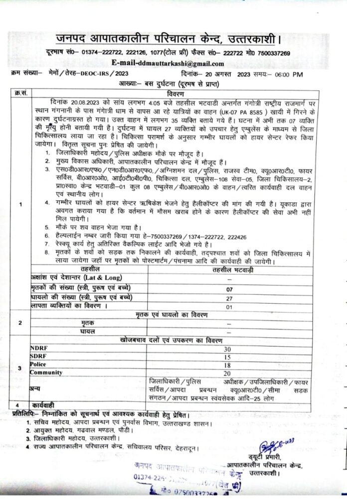 उत्तरकाशी में यात्रियों की बस खाई में गिरने के मामले में मुख्यमंत्री ने तेजी से राहत-बचाव कार्य संचलित करने के दिए निर्देश.