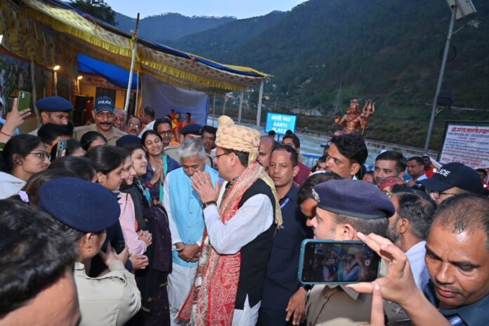 उत्तरकाशी में भागीरथी नदी किनारे आयोजित गंगा आरती में सम्मिलित हुए मुख्यमंत्री धामी