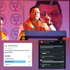 देश के आपदा प्रभावित राज्यों के मुख्यमंत्रियों के कामकाज पर आयोजित टाइम्स ग्रुप के सर्वे में उत्तराखंड के मुख्यमंत्री पुष्कर सिंह धामी ने शीर्ष स्थान हासिल किया है। देश के आपदा प्रभावित राज्यों के मुख्यमंत्रियों के प्रदर्शन को लेकर नवभारत टाइम्स ने हाल ही में एक ऑनलाइन सर्वे कराया। सवाल था “आपदा प्रभावित राज्यों में सबसे बेहतर काम करने वाले मुख्यमंत्री कौन हैं?” इस सर्वे में चार नाम शामिल थे उमर अब्दुल्ला, सुखविंदर सिंह सुक्खू, पुष्कर सिंह धामी और भगवंत मान।