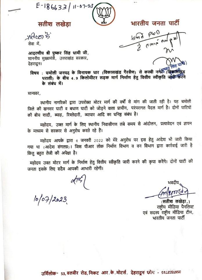 उन्होंने मुख्यमंत्री जी से अनुरोध किया कि चमोली जनपद के गैरसैण और थराली विकासखंड के बीच विनायकधार से कसबी नगर के बीच 4.5 किलोमीटर मोटर मार्ग का निर्माण ना होने से स्थानीय लोगों को लगभग 140 किलोमीटर घूम कर आना पड़ता है। जबकि दोनों क्षेत्रों के बीच शादी- ब्याह, व्यापार, सामाजिक व धार्मिक संबंधों के नाते निरंतर पैदल मार्ग से आवागमन होता आया है है। वन विभाग की अनेक आपत्तियों का निराकरण भी हो चुका है।