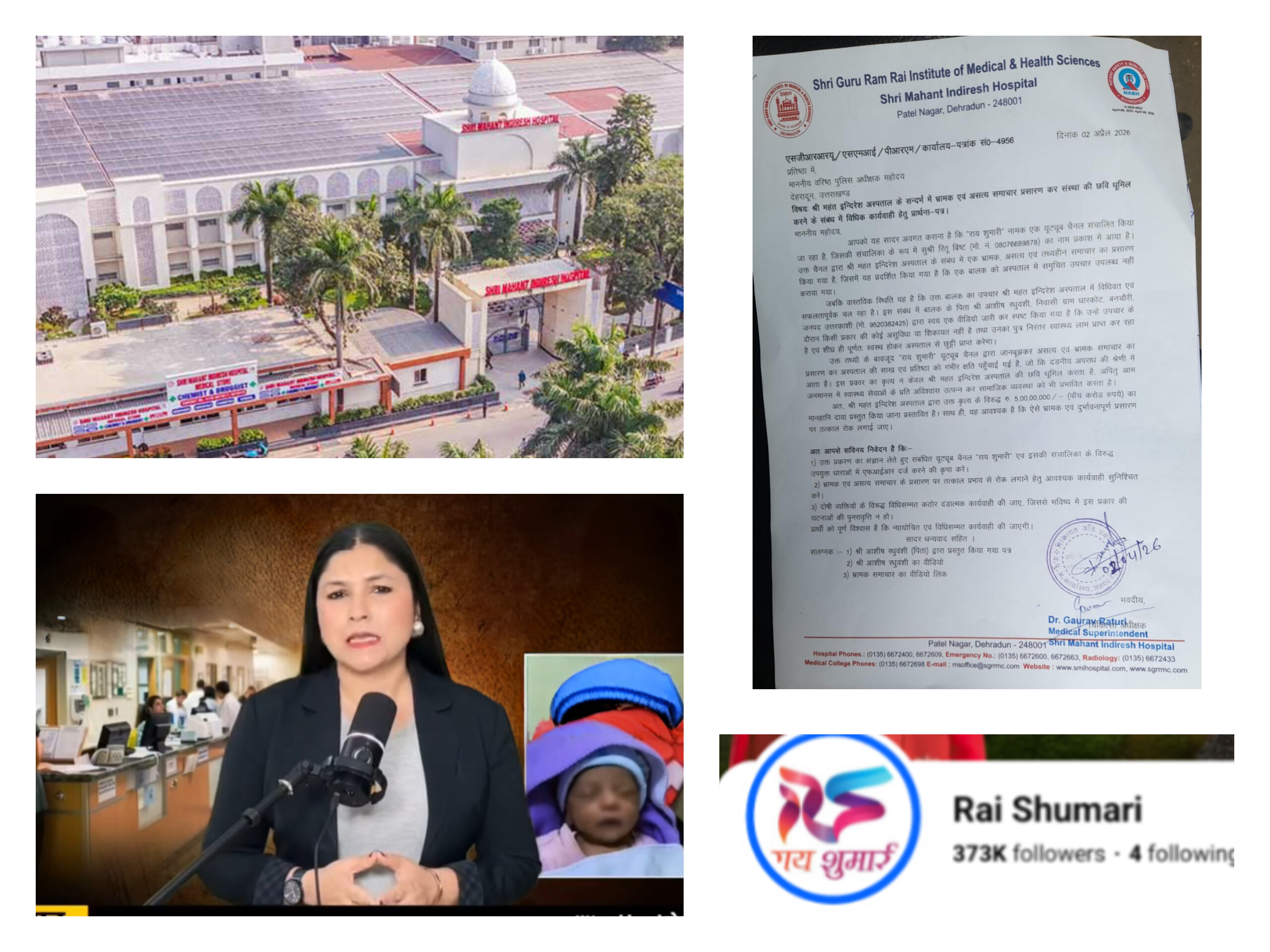 यूट्यूब चैनल ‘राय शुमारी’ ने एक भ्रामक वीडियो समाचार पोस्ट किया। वीडियो में राय शुमारी चैनल ने एक नवजात बच्चे के उपचार के मामले को तोड़-मरोड़कर पेश किया। यूट्यूब चैनल ने झूठी एवम् भ्रामक जानकारी को खबर का आधार बनाया ताकि लोगों के बीच भ्रम परोसा जा सके। इसका नतीजा यह रहा कि श्री महंत इन्दिरेश अस्पताल ने एसएसपी देहरादून को पत्र लिखकर चैनल पर कड़ी कार्रवाई की मांग की है। राय शुमारी यूट्यूब चैनल ने बिना तथ्यों को जाॅचें परखे ऐसा दावा क्यों किया ?? यह चैनल के प्रबन्धन को उनके पत्रकारों से अवश्य पूछना चाहिए। समाचार में ऐसा झूठ बोला गया कि 25 हजार रुपये के अभाव में नवजात का इलाज नहीं हो सका। हालांकि, जब पूरे मामले की जांच की गई तो सच्चाई कुछ और ही सामने आई। बच्चे के पिता ने खुद यह स्पष्ट किया कि श्री महंत इन्दिरेश अस्पताल द्वारा उनके बच्चे को उपचार देने में किसी प्रकार का कोई भी विलम्ब नहीं किया गया।