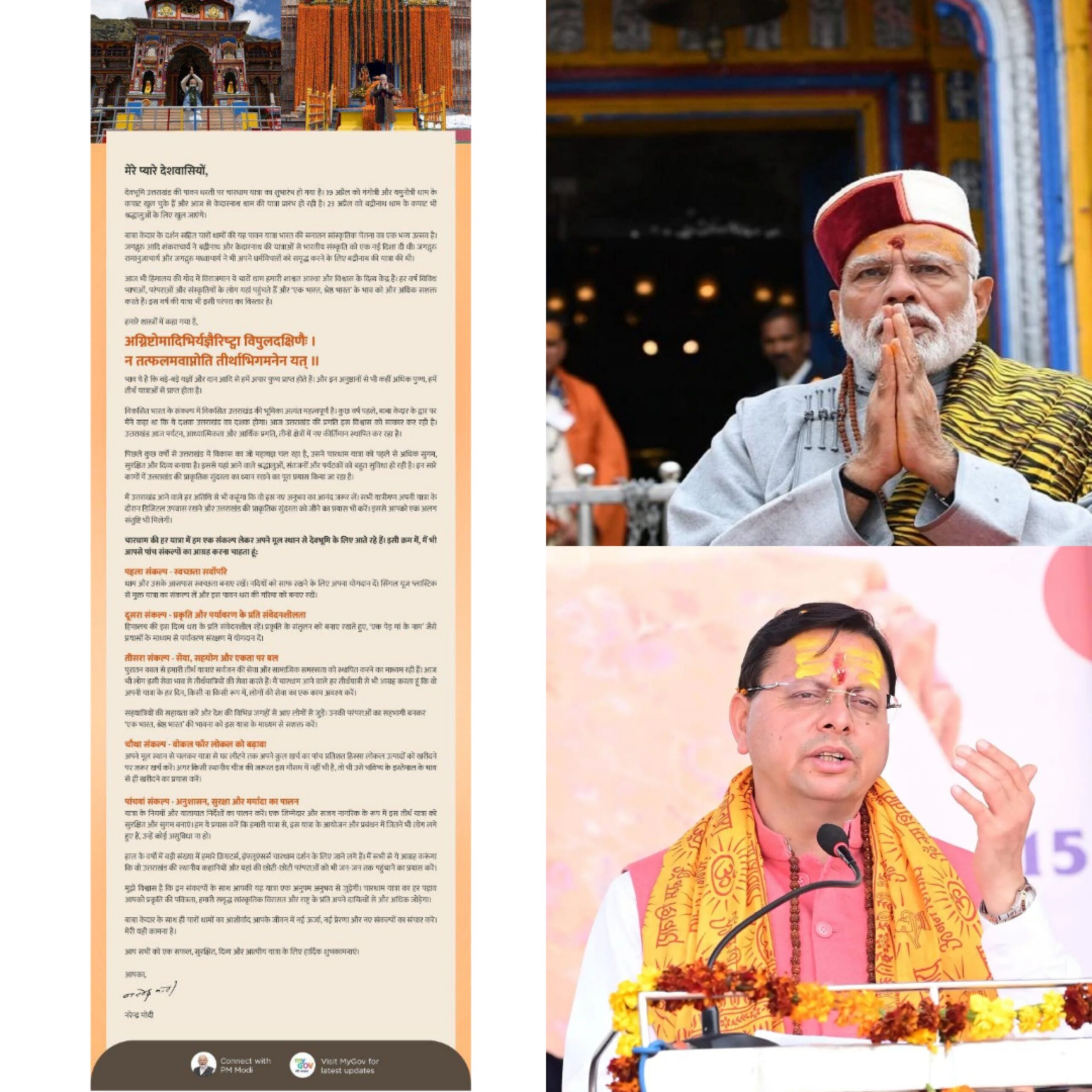 आदरणीय प्रधानमंत्री जी द्वारा दिए गए पांच संकल्प सफल और दिव्य यात्रा की आधारशिला हैं। इन संकल्पों को अपनाने से न केवल चारधाम यात्रा स्वच्छ, सुरक्षित, सुव्यवस्थित और अनुशासित बनेगी बल्कि प्रकृति भी संरक्षित रहेगी, व्यवस्थाएं सुचारू रहेंगी, आपसी सहयोग का भाव बढ़ेगा और हर श्रद्धालु को एक शांत, पवित्र और दिव्य यात्रा अनुभव प्राप्त होगा।
