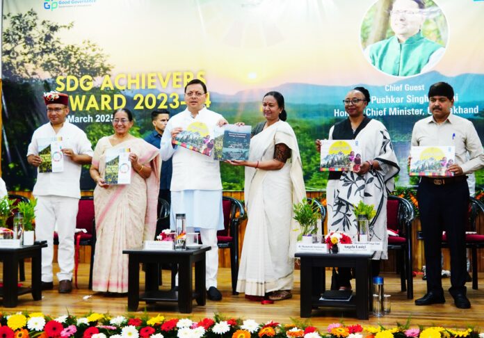 मुख्यमंत्री श्री पुष्कर सिंह धामी ने सोमवार को मुख्यमंत्री आवास स्थित मुख्य सेवक सदन में एस.डी.जी एचीवर अवार्ड समारोह में 3 व्यक्तियों, 09 संस्थानों और 04 औद्योगिक प्रतिष्ठानों को एसडीजी अचीवर अवार्ड से सम्मानित किया। पिछले वर्ष के एसडीजी अवॉर्ड से पुरस्कृत व्यक्तियों और संस्थानों द्वारा की जा रही अभिनव पहलों की पुस्तक ‘अग्रगामी 2.0’ और एसडीजी इंडेक्स उत्तराखण्ड 2023-2024 का लोकार्पण भी इस अवसर पर मुख्यमंत्री ने किया। सी०पी०पी०जी०जी० द्वारा वर्ष 2023-24 के लिए जारी जनपदवार एस०डी०जी० रैंकिंग में नैनीताल जनपद ने प्रथम स्थान, देहरादून दूसरे और उत्तरकाशी तीसरे स्थान पर रहे, तीनों जनपदों के मुख्य विकास अधिकारी को मुख्यमंत्री द्वारा सम्मानित किया गया।