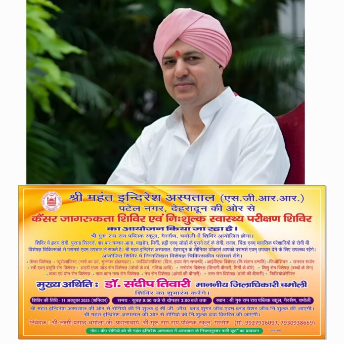 श्री गुरु राम राय एजुकेशन मिशन/ विश्वविद्यालय / मेडिकल कॉलेज और उसके अंतर्गत संचालित श्री महंत इन्दिरेश अस्पताल, देहरादून द्वारा — सरकार के सहयोगी संस्थान के रूप में — गैरसैंण में निःशुल्क स्वास्थ्य एवं कैंसर जागरूकता शिविर का आयोजन किया जा रहा है।